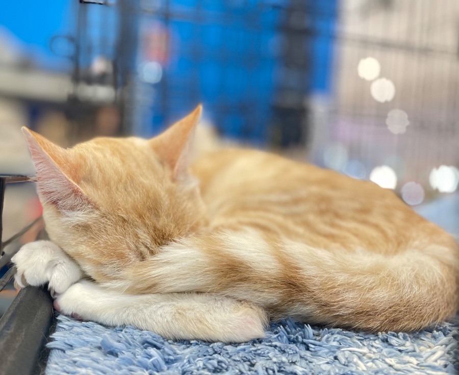 Sunny is a Domestic shorthaired cat with a beautiful tabby ginger coat. His tabby stripes and patterns are unique to himself. This boy is also mitted having the cutest white feet, making him look like he is wearing socks.