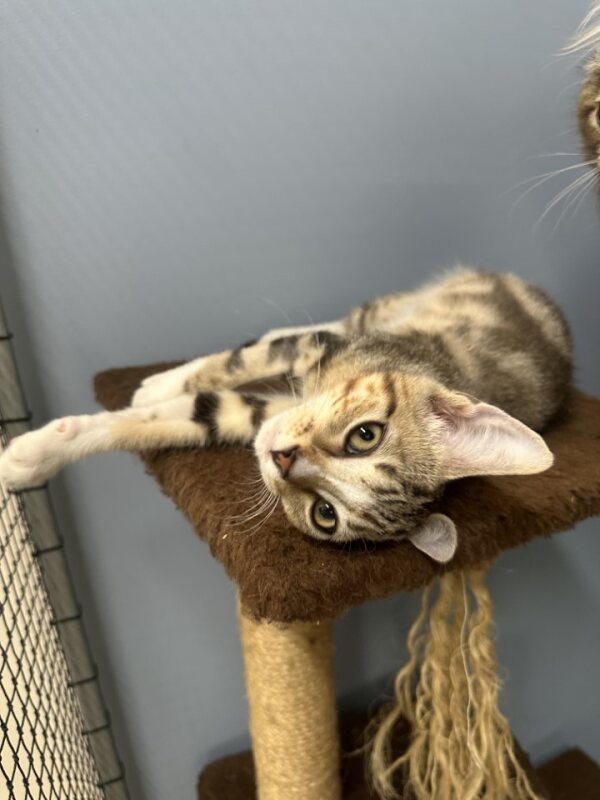 Like most kittens, Bauble is playful, curious, and full of charm. He enjoys batting at toys, chasing imaginary treasures across the room, and exploring every cozy corner he can find. After a good play session, he is ready to recharge with a nap in a sunny spot or tucked into a soft blanket. He is at the perfect age to continue learning about the world, and with gentle guidance he will grow into a confident and well-mannered companion.