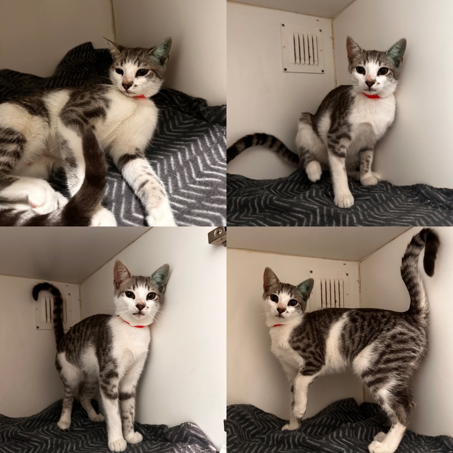 Halo is a beautiful grey tabby-and-white girl with the softest eyes and an even softer heart 🐾💕
