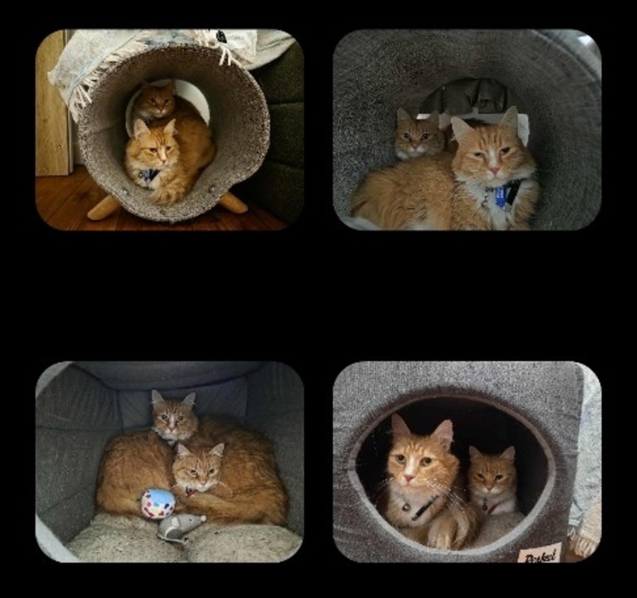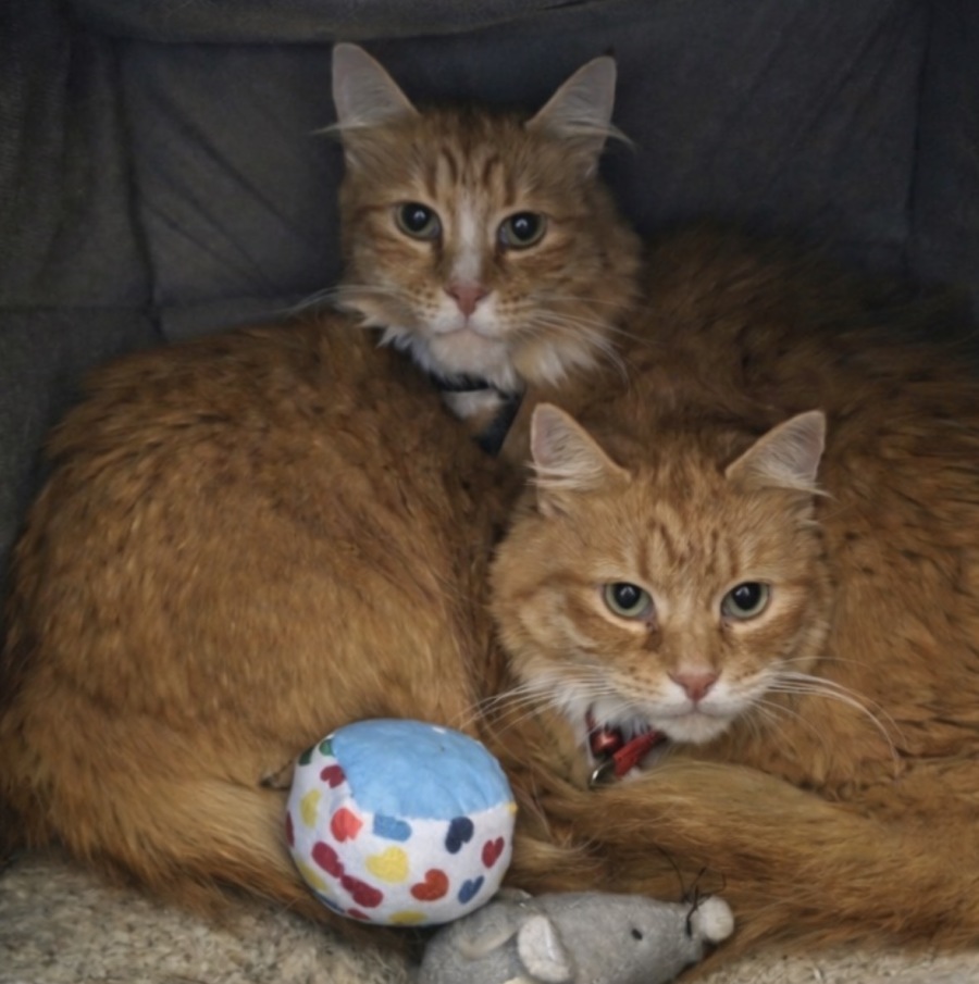 Louie is the more outgoing one (red collar). She loves snuggling close to her humans and is the more inquisitive of the two. Jewie is friendly once she has gotten to know you and feels comfortable.