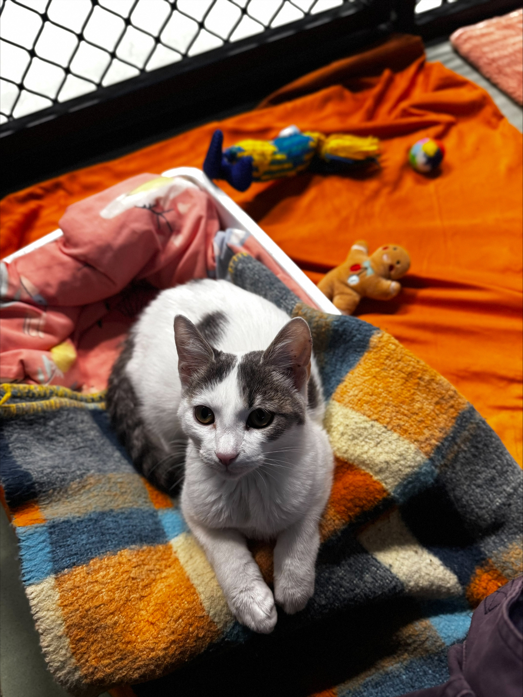 If you're looking for a sweet, social little kitten who will knead your blankets, your lap, your hoodie strings, and maybe even your heart... I'm your girl. Adopt me, and I'll make sure your home always smells like fresh, imaginary baked goods.