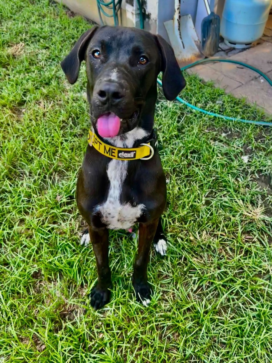Pepper is a happy go lucky young Great Dane cross pup with a heart just as big as his long, lanky legs. He has the most adorable goofy strut, a tail that seems almost as long as his legs, and soulful brown eyes that will be sure to melt your heart. Add in his shiny, soft, deep black coat and you’ve got one very handsome boy.