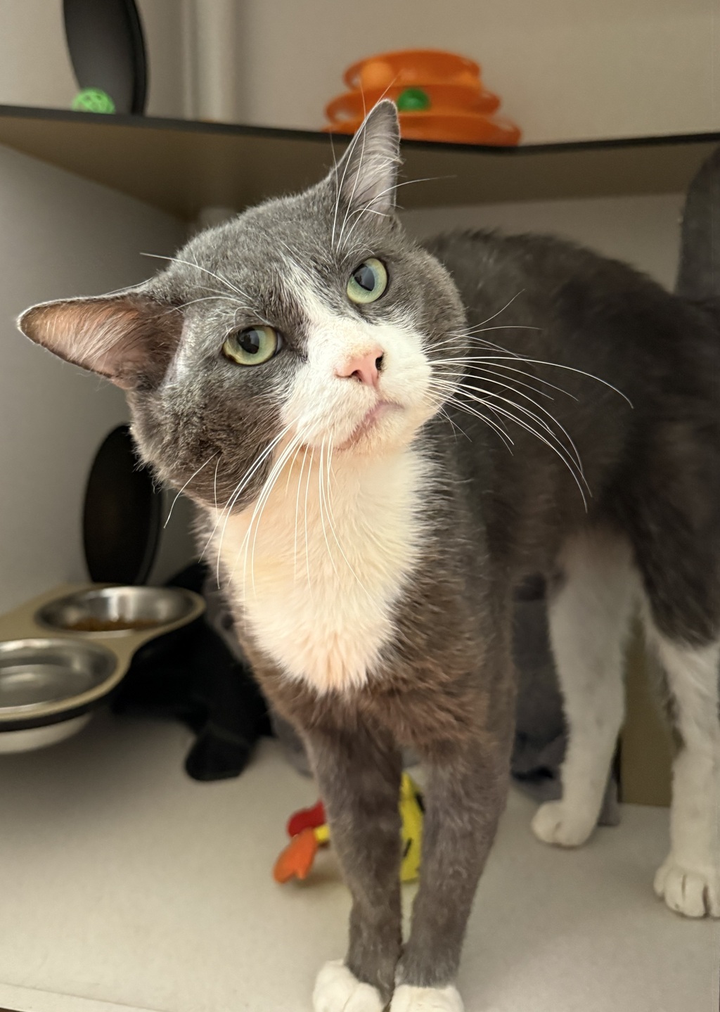 He can be a little reserved at first and prefers the cozy safety of his condo while settling in - but don't worry, he'll still pop over to the door for a gentle pat. With a calm introduction (we recommend starting him in a launch room for 3-5 days), plus some comfy hidey holes and a good cat tree to perch on, he'll blossom at his own pace.