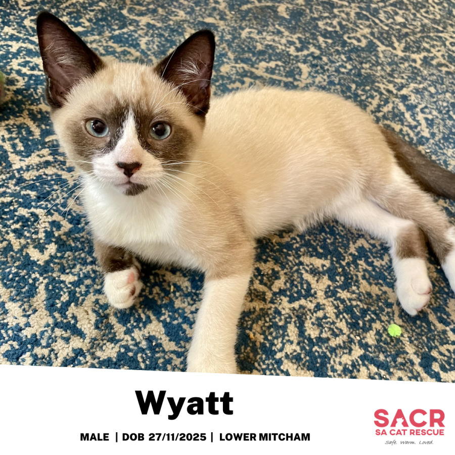 Wyatt is a charming little seal-point boy with the cutest white nose and dainty white feet - truly a masked little gentleman in the making! This playful adventurer spends his days zooming and tumbling with his siblings, investigating every corner of the house with curiosity and mischief, before melting into the coziest cuddles when the action winds down.