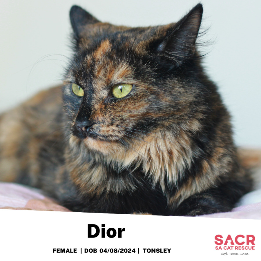 Dior's adoption fee is $75 which includes desexing, microchipping, parasite prevention, and initial F3 vaccination.