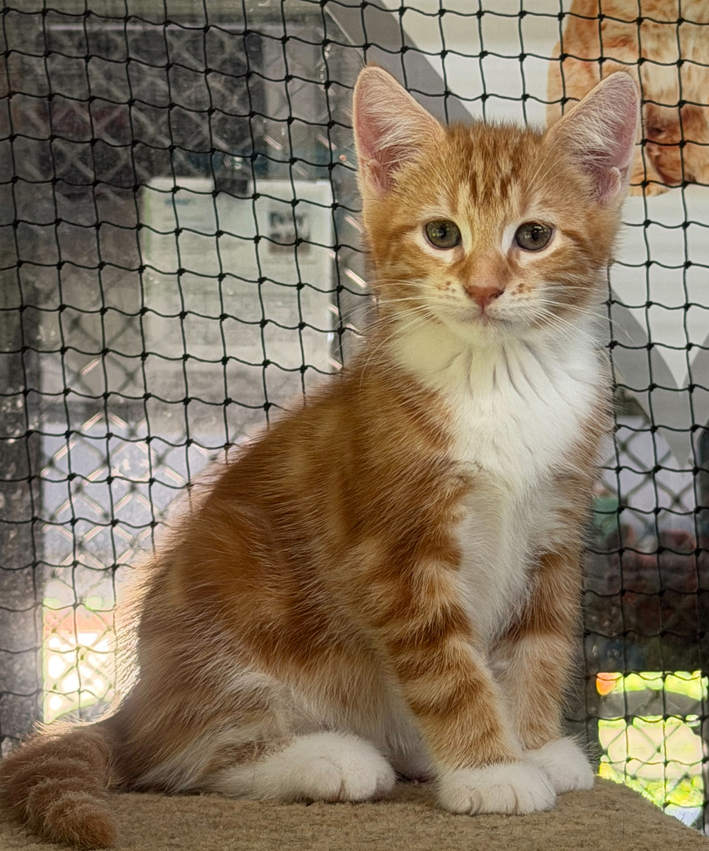 I am the fluffy twin borther and I am bit shy at first, but once I warm up, I'm all purrs and play. I was named after a character from a magical world, and I think I've got some magic in me too! I love chasing toys and exploring every nook. I came into care with my mum and siblings, and we are becoming more confident to meeting people and trusting them. I dream of a cozy home where I can snuggle up with you. Adopting me means endless love and playful adventures. Let's make some magic together!