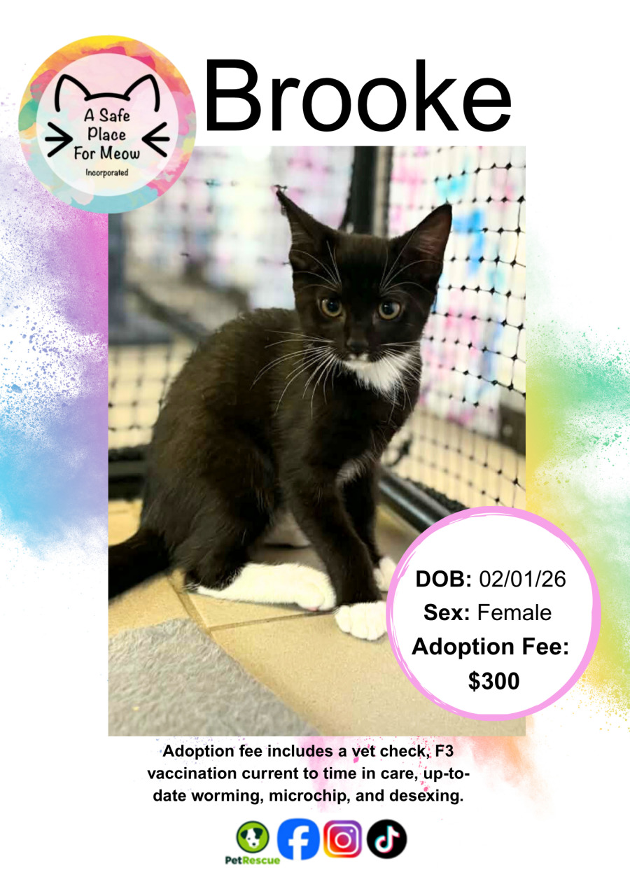 While her playful antics are sure to entertain, it's Brooke's sweet side that truly shines. She's a gentle soul who adores affection and will happily curl up beside you for some quiet cuddles after a busy day. Her tender purrs and soft nuzzles are a daily reminder of the deep bond she forms with those she loves.