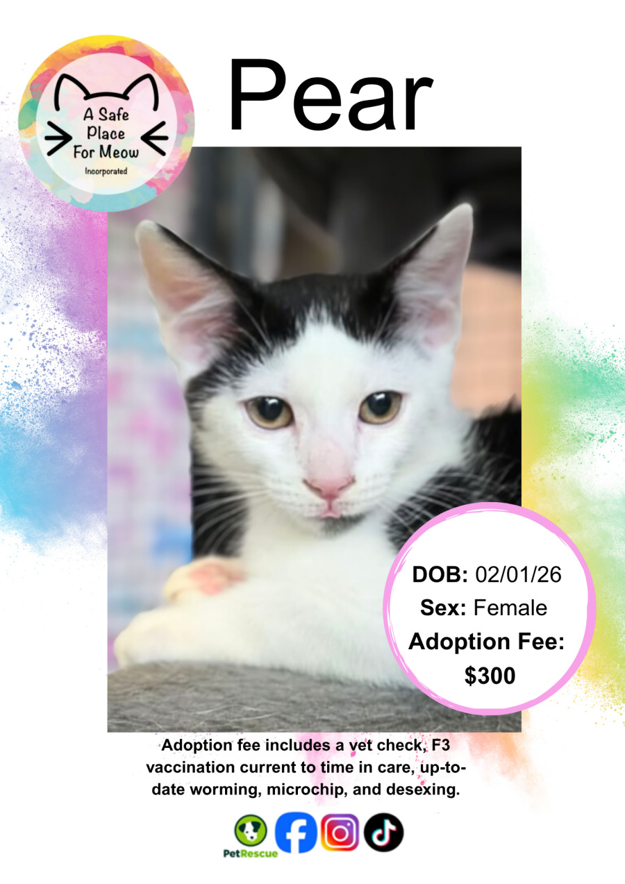 Pear, a delightfully sweet and playful feline who is eagerly awaiting a new family to shower with affection. This charming cat has a knack for turning everyday moments into joyful experiences with her lighthearted antics and unwavering love.