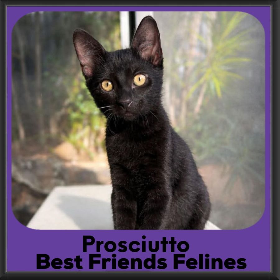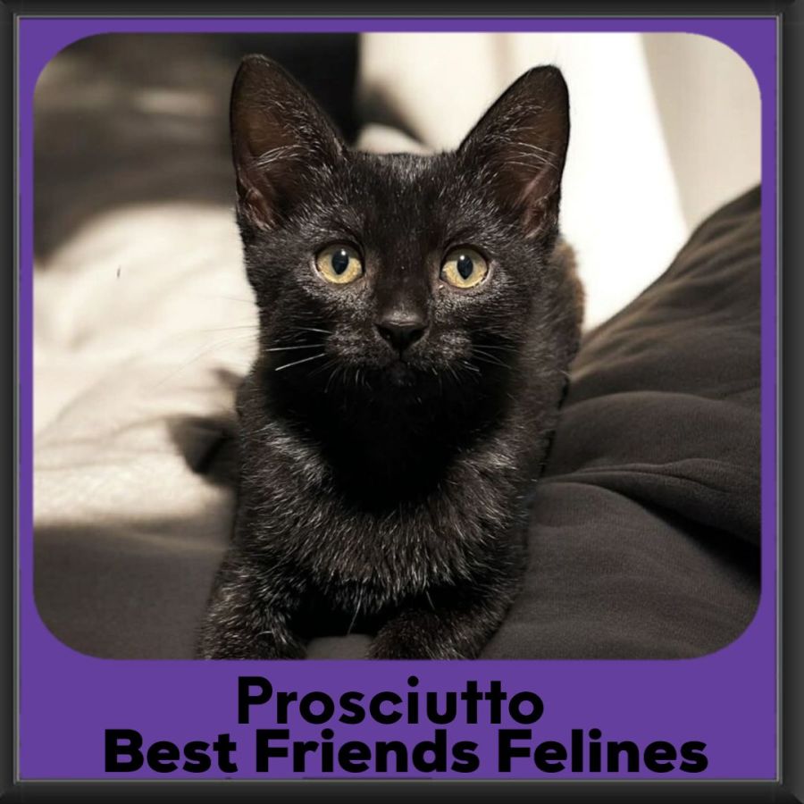 Prosciutto is a sleek black kitten with glimmers of white and subtle tabby markings that shimmer in the sunlight. In certain light, his coat tells a secret story — a little artwork hidden in plain sight.