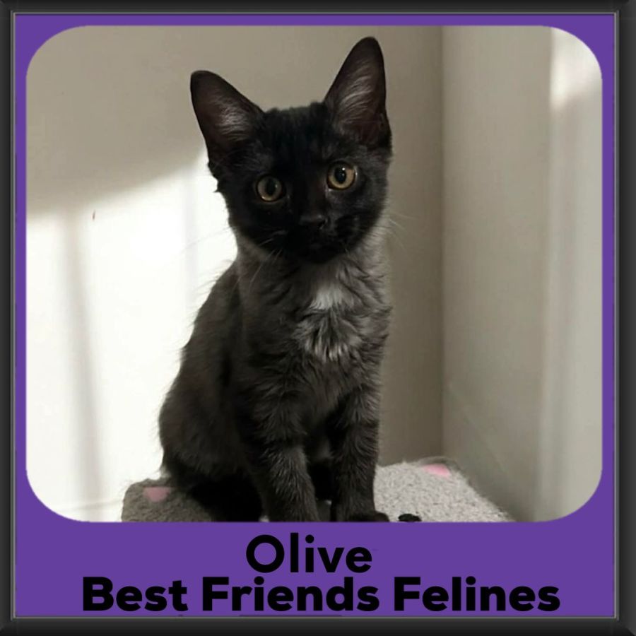 As a tiny kitten, Olive had a brief tummy bug and lost some of her fur while recovering. She is now completely well, and her coat is growing back quickly — she’ll soon be back to her full, glossy black kitty self.