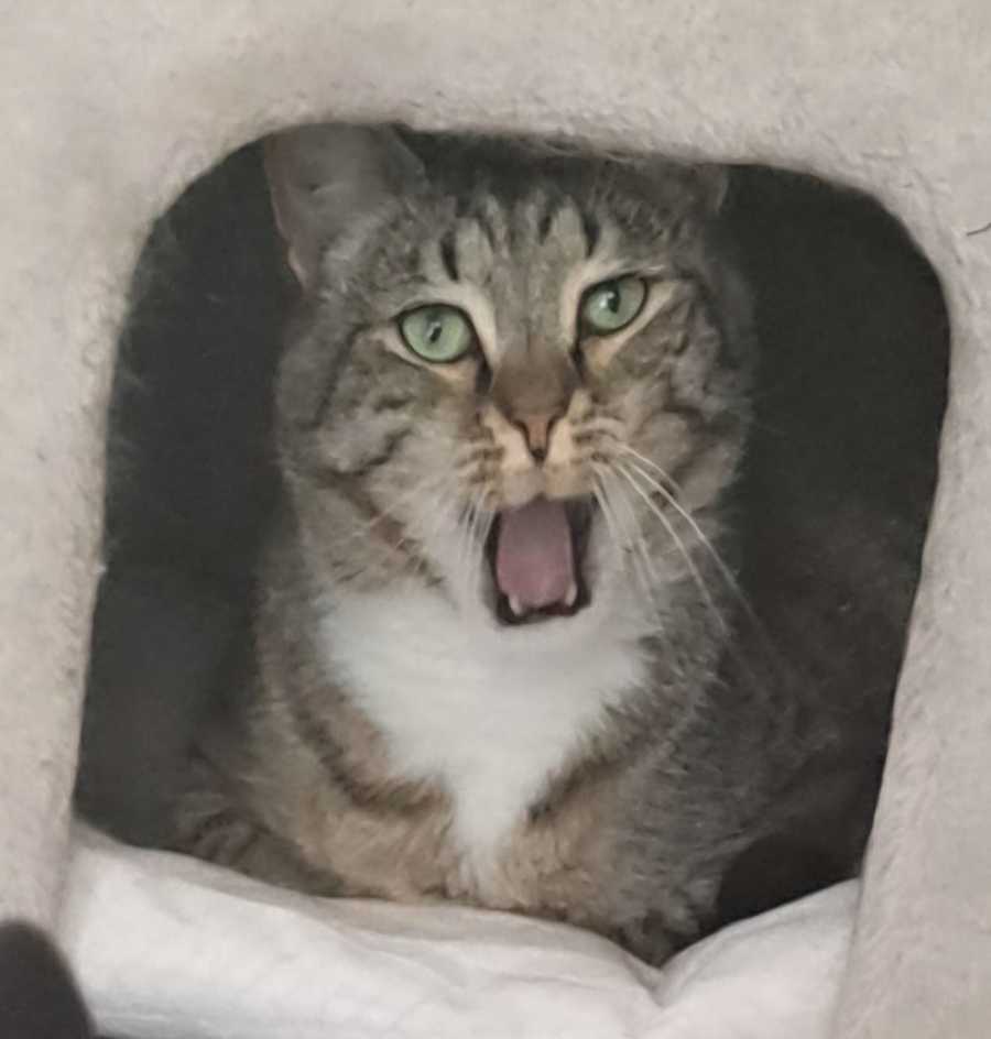 Bowie loves to play and loves sunbaking and eating grass in his cat run. He enjoys a head scratch once he is comfortable.