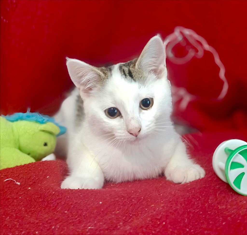 Meet Lucy, a beautiful white and tabby kitten with a delicate, pretty look and a heart full of charm. This sweet girl loves her kitten playtime activities - whether she's batting at toys, practicing her tiny pounces, or exploring with bright-eyed curiosity. Playful and full of life, Lucy brings a gentle sparkle to every room she enters.