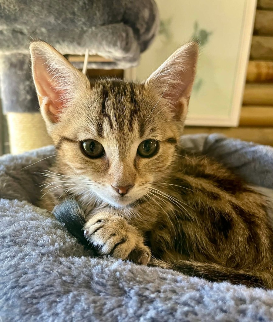 A stunning brown tabby with a calm, chilled-out vibe. Lenny loves to climb high & survey his kingdom from above — a tiny king in the making 👑