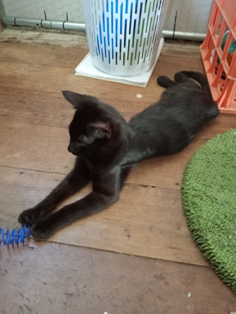 Nehira is a striking, athletic girl with a quiet confidence about her. When she stretches out in a warm patch of sunlight, beautiful tabby swirls appear through her dark coat - a little glimpse of the magic beneath.