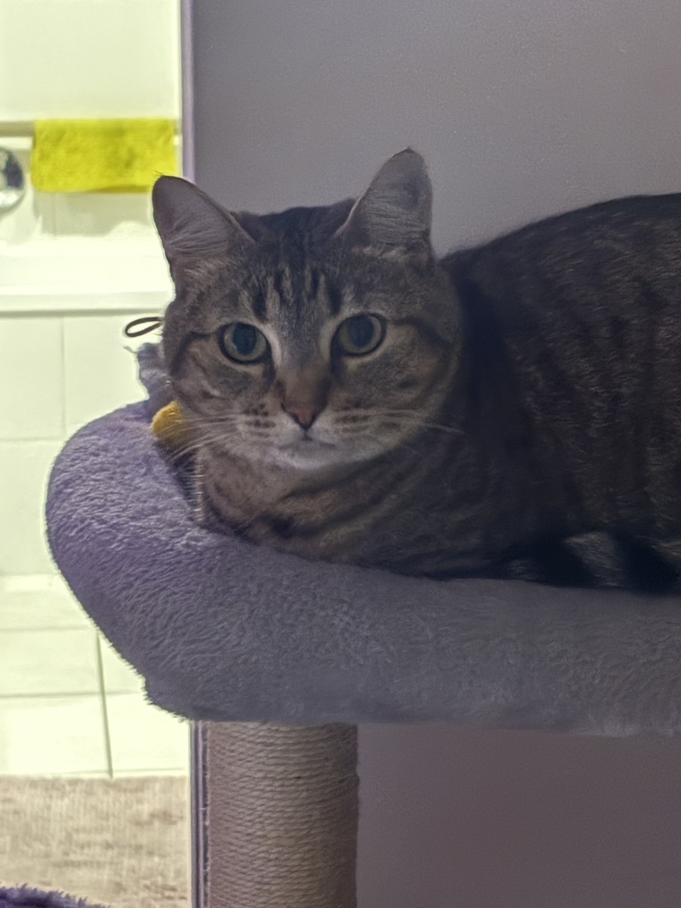To help her feel safe and enriched, Fuzz would love: Cat trees and sturdy scratching posts, Cozy hiding spots like cardboard boxes or cat igloos