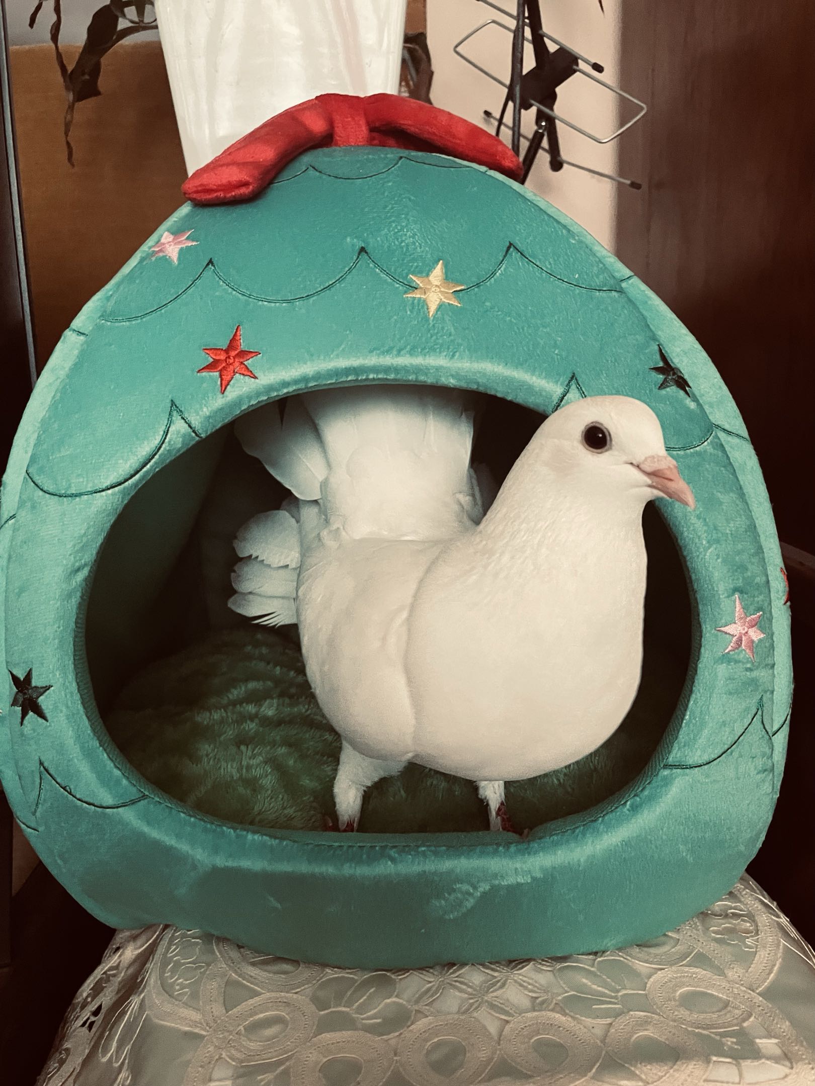 He loves novelty and will investigate new objects or spaces with enthusiasm. His mirror is another favourite — you may hear him happily cooing while admiring it.