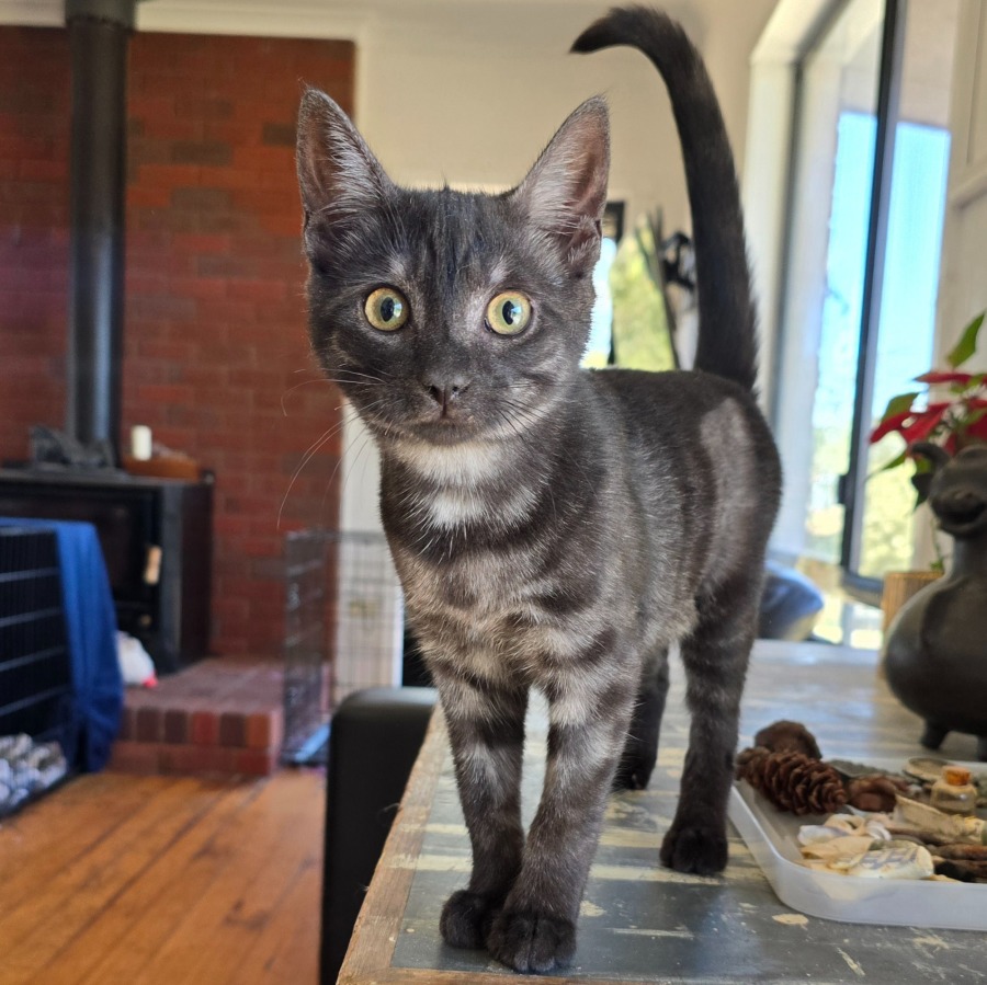 This sweet girl has already proven she’s a little survivor. Smoke was rescued after being stuck in a storm drain for several days, and despite her rough start, she has come out the other side full of affection, curiosity and playfulness. She is confident, cheeky and loves to explore, but her favourite place is curled up in your arms, purring like a tiny engine.