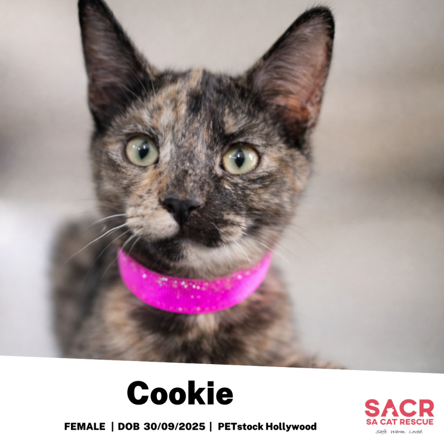 Cookie is a beautiful classic torti girl with that stunning patchwork coat only torties can pull off so perfectly. She’s playful, sweet, and just the right amount of adventurous - always ready to explore a new corner of the house or investigate whatever you’re doing.