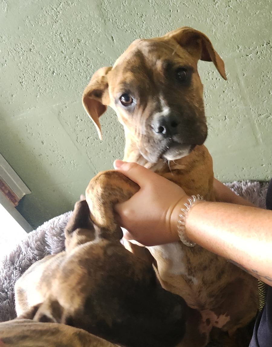 Hi, my name is Ronda (Rousey) and I'm a young Boxer mix puppy looking for my forever home. I'm a fun, active girl who loves being on the go and exploring the world. I also adore cuddles and will happily soak up all the love and attention once I've had a chance to burn off some of my puppy energy.