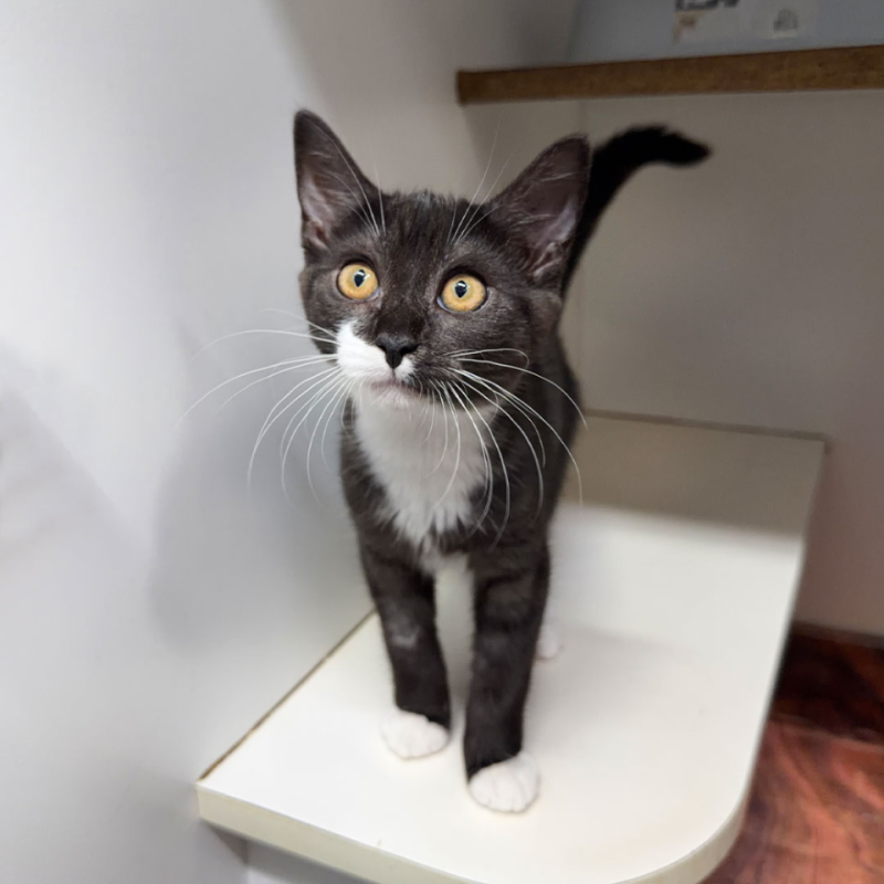 Liquorice is a confident, affectionate kitten who brings her own special flair to every interaction. She’s wonderfully social and loves being around people, always ready to come over and see what you’re up to. Playtime is her favourite part of the day, and she’s known for her signature little dance move - a playful strecth and reach of her paws that makes her impossible not to smile at. Liquorice is curious and enjoys exploring her surroundings, happily turning everyday moments into something fun. She’s sweet, outgoing, and thrives on attention, making her a delightful kitten to have around and a lovely addition to a home ready for a playful, loving personality.