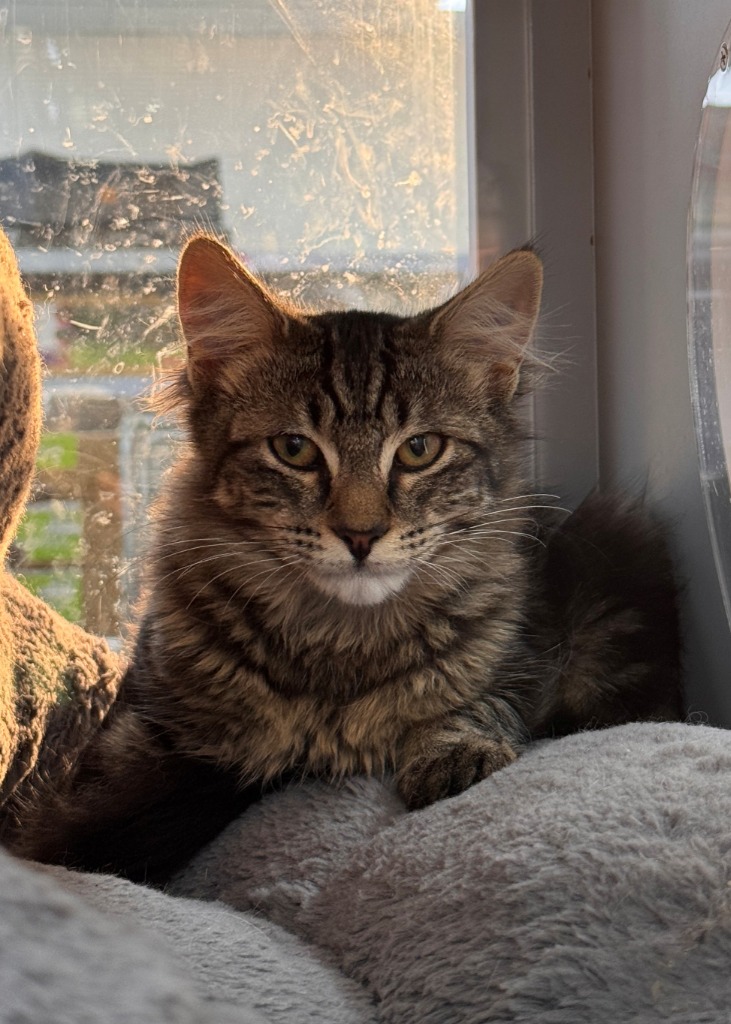 A stunning marbled brown tabby with magnificent ear tufts, oversized paws and big expressive ears, Oscar is clearly going to be a very big, very handsome boy. This domestic medium hair lad already has a kingly presence, with a soft, fluffy coat and a strong, muscular build. Despite occasionally pulling dramatic facial expressions when he’s unsure, he is not a grouch at all — just a sensitive soul figuring things out.