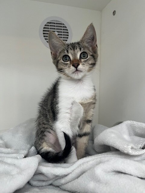 Hi, I'm Milani, a female Domestic Short Hair kitten. Age: 2 months. I’m an average-energy companion who loves a bit of zooming around, then a cozy cuddle on your lap. I’m curious, friendly, and quick to purr when you talk to me. I adore sunbeams, soft blankets, and safe toys that rattle or flutter. I’m learning to trust new people and I’ll thrive with a patient home that can give me daily play and gentle affection. Best with children: I have no known child-related issues. I’m looking for a family that will grow with me and celebrate every tiny milestone as I become braver and more confident. If you want a sweet, affectionate kitten to brighten your days, I’m Milani and I can’t wait to meet you.