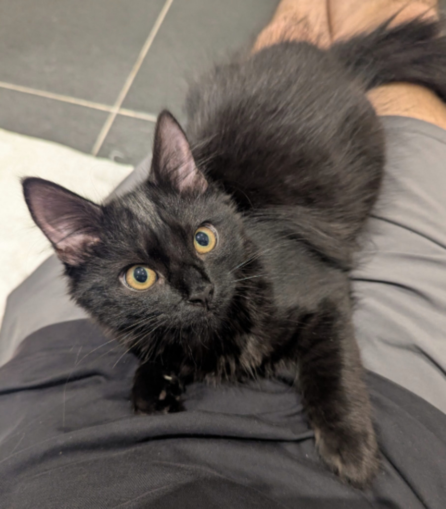 Purl is a darling 4-month-old kitten and the smallest — and cuddliest — of the boys. This sweet little guy adores curling up for a nap on your lap (or honestly, anywhere cozy he can find!) and will happily melt into you for snuggles. When he’s not snoozing, Purl shows off his playful, cheeky side by nibbling on his toys and occasionally even his own paws, as if they’ve surprised him mid-play.