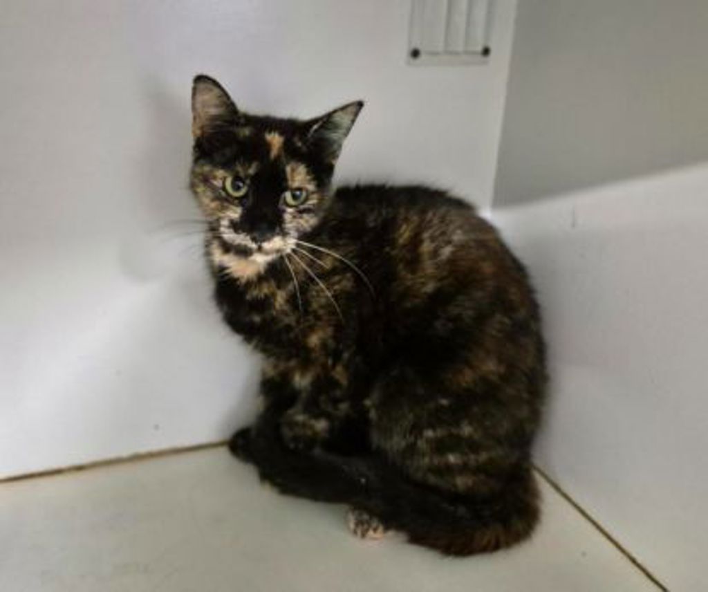 Meet Spooky, a scruffy little black tortoiseshell who looks like she's just finished exploring a chimney and had a fantastic time doing it. With her smoky, speckled coat and slightly chaotic fur, Spooky has perfected the "adorably messy gremlin" aesthetic.