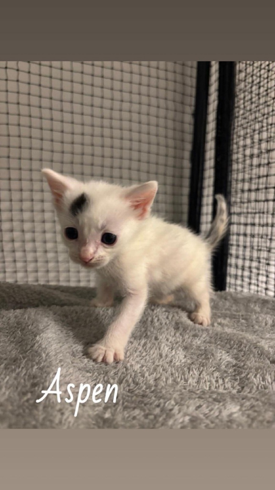 Meet Aspen, the charming white feline with a singular black spot on his head, a mark as unique as his personality. Aspen was discovered with his mum and six siblings as a newborn, and against the odds, Aspen persevered alongside his two surviving sisters. Now, this resilient little guy is ready to meet his new family and become a cherished companion.