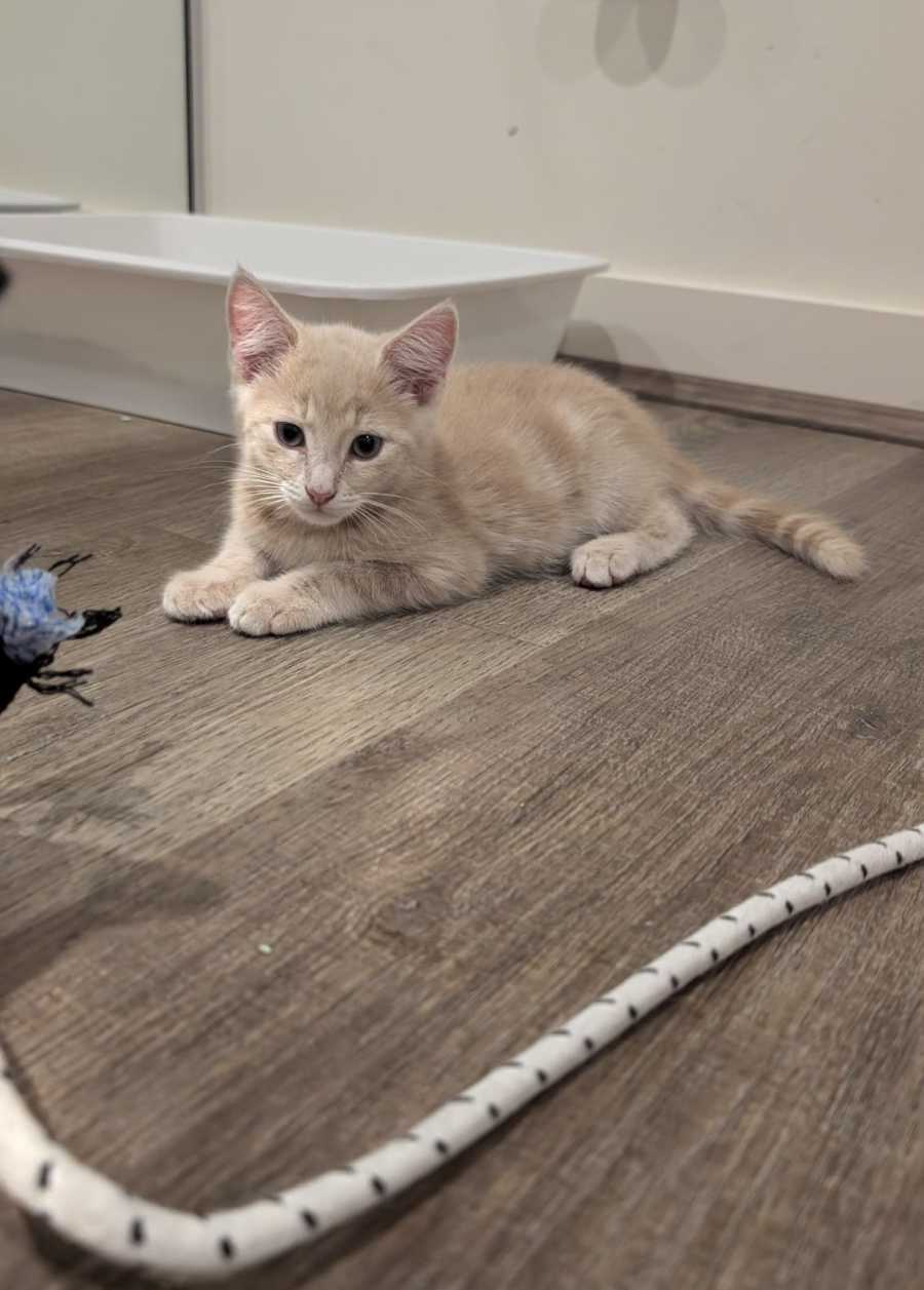 Cairo loves to play and is high energy so would do best adopted with one of his siblings or to a home with another kitten or young cat.