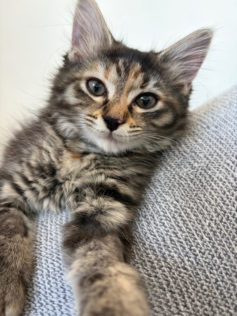 Francesca Moo is a beautiful 4 month old kitten with a fluffy medium length coat, tabby stripes and spots, and striking tortoiseshell face colouring. She was born in foster care after her mum, Minnie, was rescued from a colony while unknowingly pregnant. Arriving as a midnight surprise under the bed, Francesca has since grown up safe, loved, and ready to find her forever family.