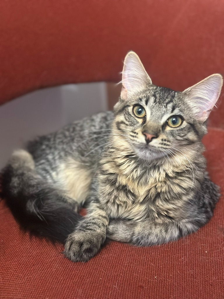 Bluey is pure personality wrapped up in the most stunning tabby coat youāve ever seen. With his gorgeous medium-length fur, striking kohl-rimmed eyes, and an adorable pink nose, heās a total heart-stealer ā and he knows it. Heās also got the most floofiest tail weāve ever seen, and he takes great pride in grooming it.