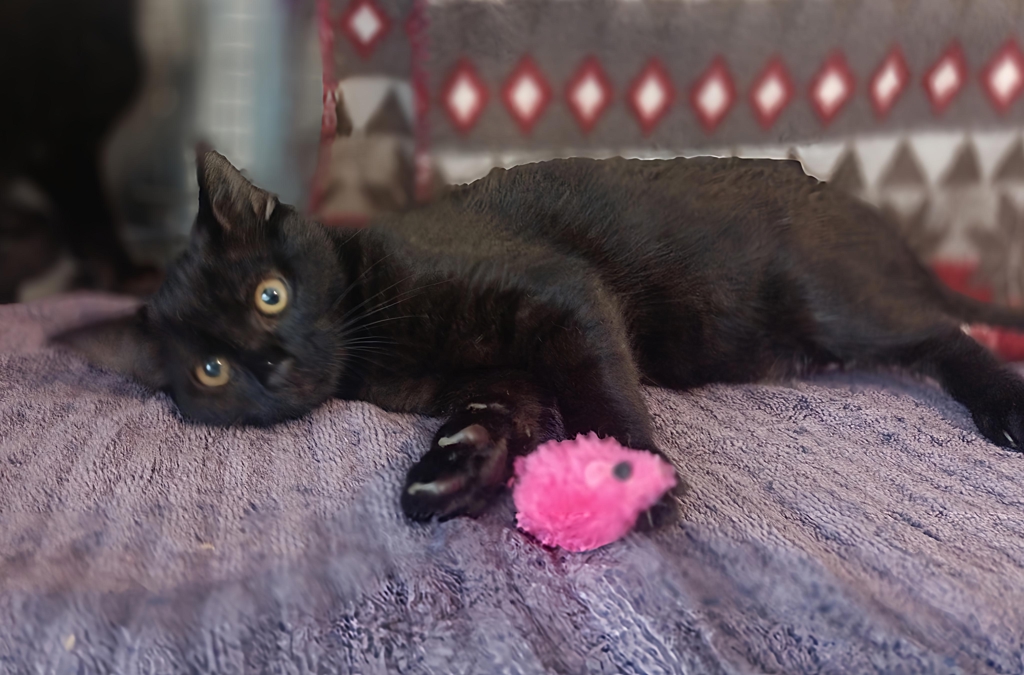 Raven is a gorgeous black kitten with a big personality and an even bigger heart. This confident little girl has had all of her vet work completed and is ready to find her forever home. Raven is a happy, playful kitten who loves chasing her toys and exploring everything around her. She's also a total purr machine who enjoys being around people and soaking up attention.