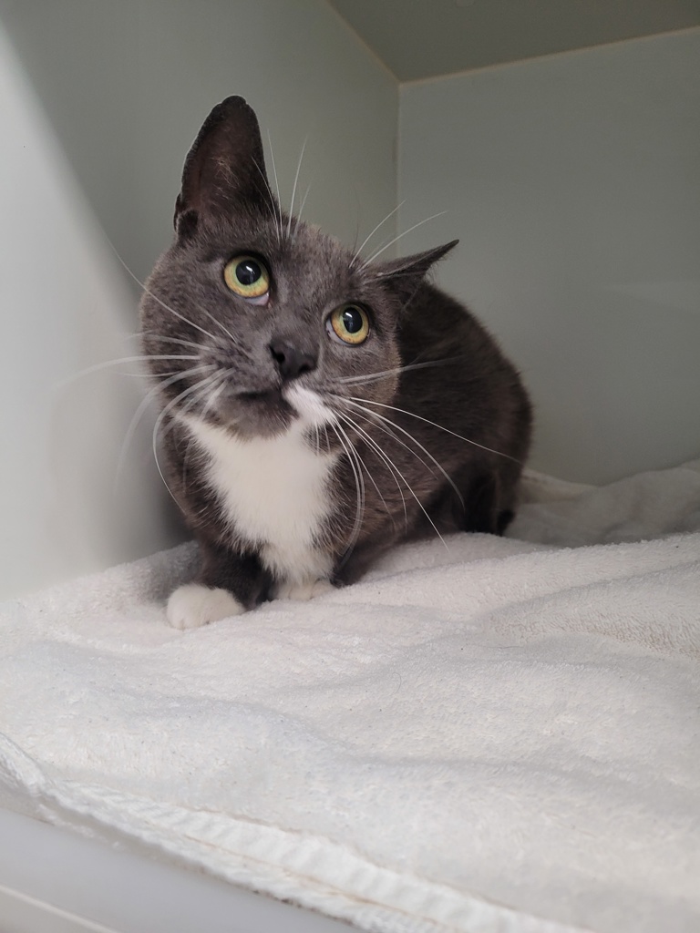 Phillipa is a 3-year-old grey and white sweetheart with a soft, gentle nature. This lovely girl can be a little shy at first, but she is wonderfully friendly with everyone she meets and simply needs a calm, quiet home where she can truly relax and feel safe.