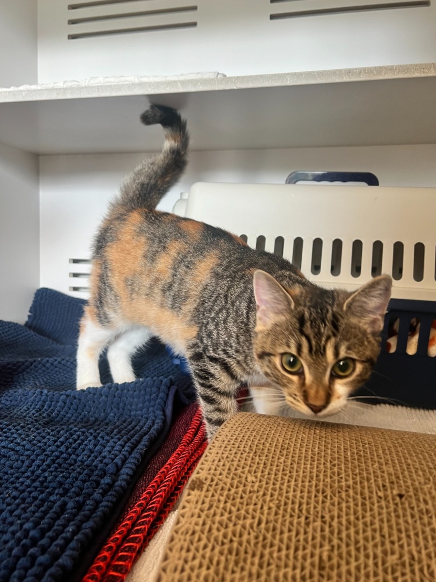 Chloe is a bright, spunky little kitten bursting with energy and personality! She loves to play, explore, and turn just about anything into a toy. Because she’s such an active girl, Chloe will thrive in a home that can keep her entertained with plenty of enrichment, playtime, and stimulation to help channel her playful spirit. She would do best with adopters who enjoy an energetic companion and are happy to engage with her curious, mischievous side. Due to her high energy and enthusiasm during play, Chloe is best suited to a home with children aged 8 years and older. With the right environment, this lively girl will bring endless fun, laughter, and affection to her new family. 🐾💛