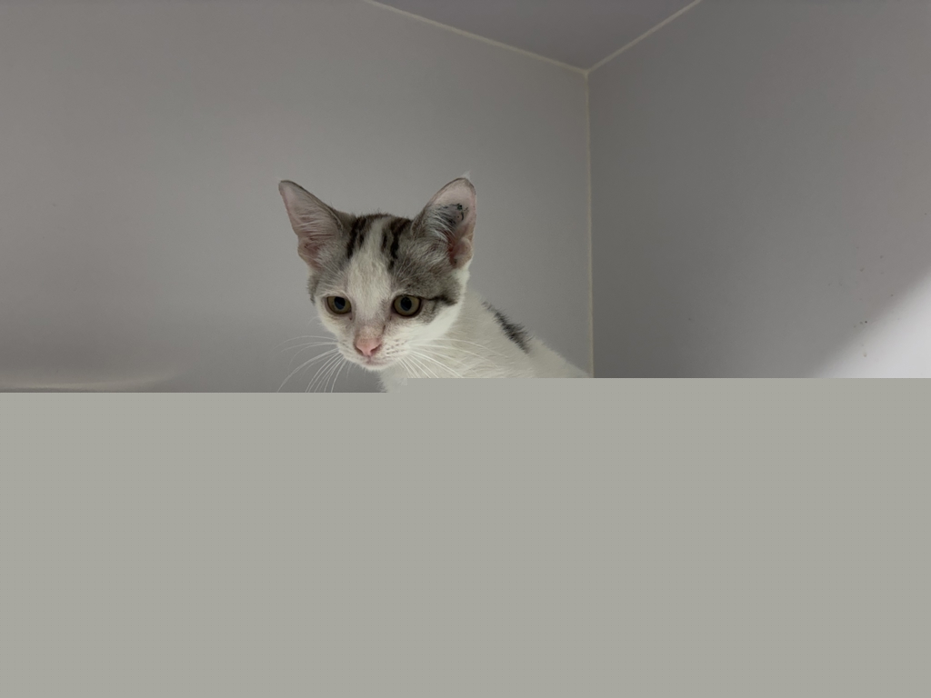 I'm a little kitten with a rather unique look about me. Most of me is snowy white, but I've got these very stylish tabby blotches scattered across my coat that make me stand out in a crowd. I like to think they give me a bit of extra character, a sort of "one-of-a-kind" look.