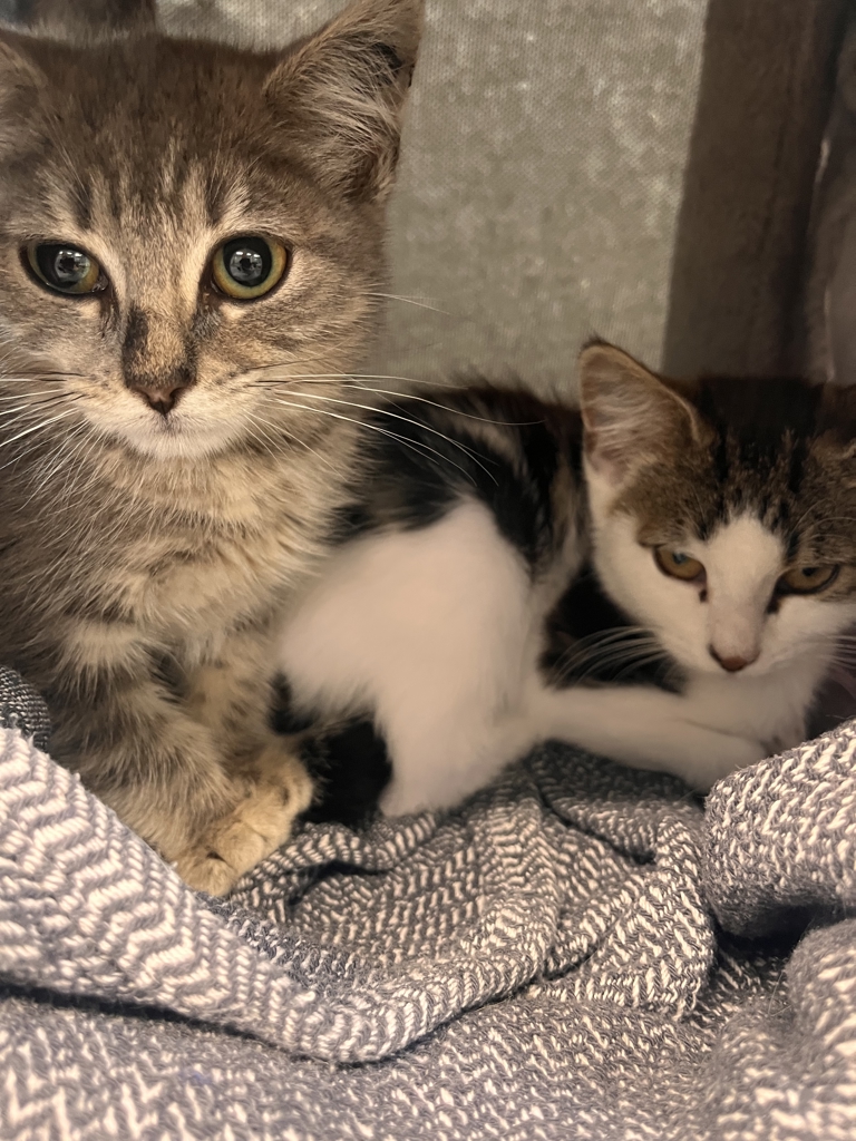 (grey tabby on the left) - Timid kitten - will need time to adjust to your home - no young children.