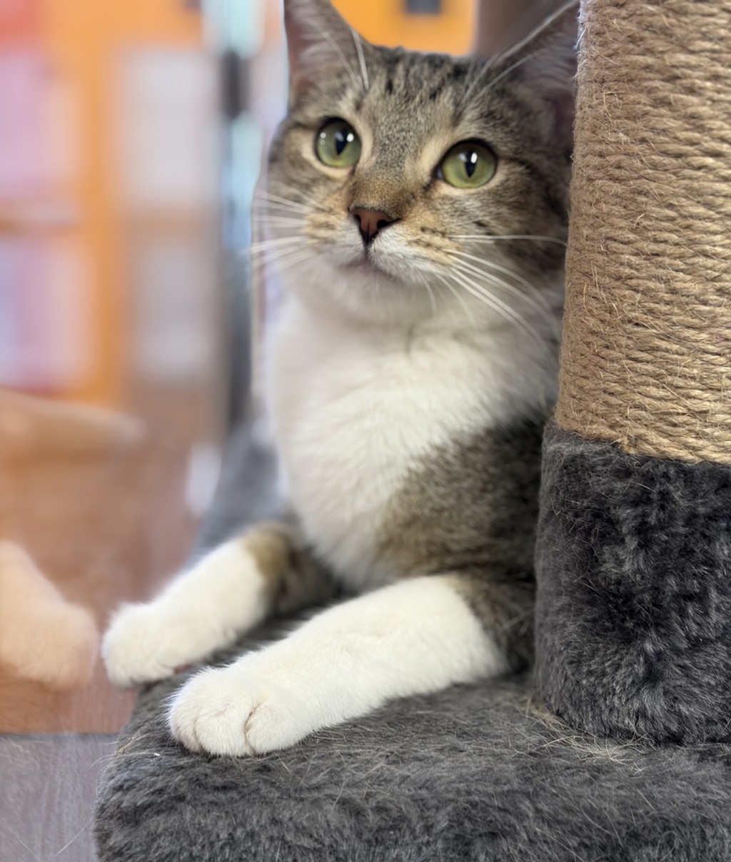 Harriet is a lovely 1½-year-old tabby girl with a playful spirit and a very sweet nature. She loves to stay active and can often be found zooming around and playing with her kitty roommate. Harriet has a fun, curious personality and enjoys exploring her surroundings and chasing toys. Despite her energetic side, she's also incredibly affectionate and enjoys spending time near her people. She would thrive in a home where she has space to play and plenty of love to go around. Harriet would likely enjoy living with another friendly cat who can keep up with her playful energy. With her charming personality and adorable antics, she's sure to bring lots of joy to her future family.