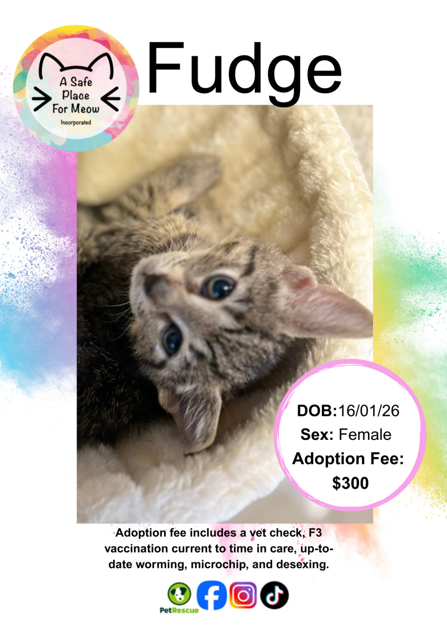 Prepare to be enchanted by Fudge, a delightful feline who is the epitome of cuteness overload! This sweet-natured cat is filled with an abundance of playful energy that will keep you amused for hours on end. Her captivating personality and heartwarming antics make her an endearing companion that lights up every room she enters.