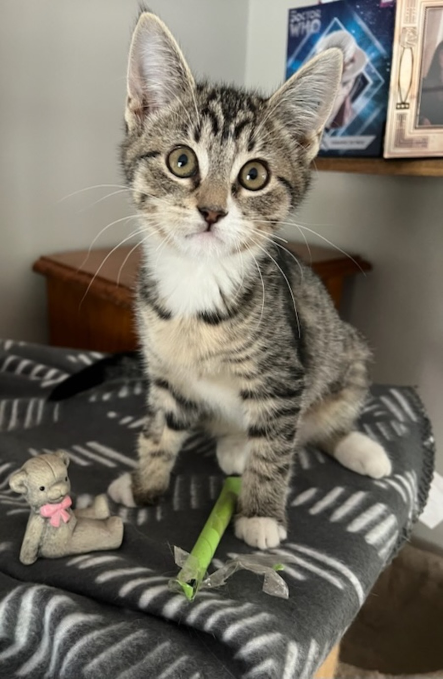 The tunnel toy is her joyful time, rushing in and out, chasing Cricket and the other adult cats. She has lived with a dog, Paint and seems to be ok with everyone in the house. Bumblelina has not lived with kids, we are not sure how she would be.