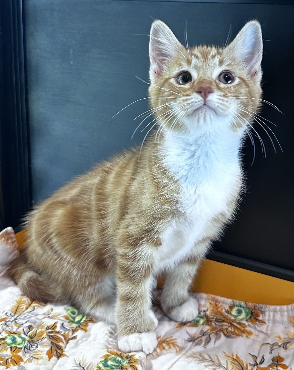 Betty is sweetness wrapped in sunshine. With her ginger tabby coat, bright white chest, and dainty white feet, she looks like she's always dressed for a special occasion. She's a gentle, people‑oriented kitten who adores cuddles, soft blankets, and being told she's beautiful (which she absolutely is).