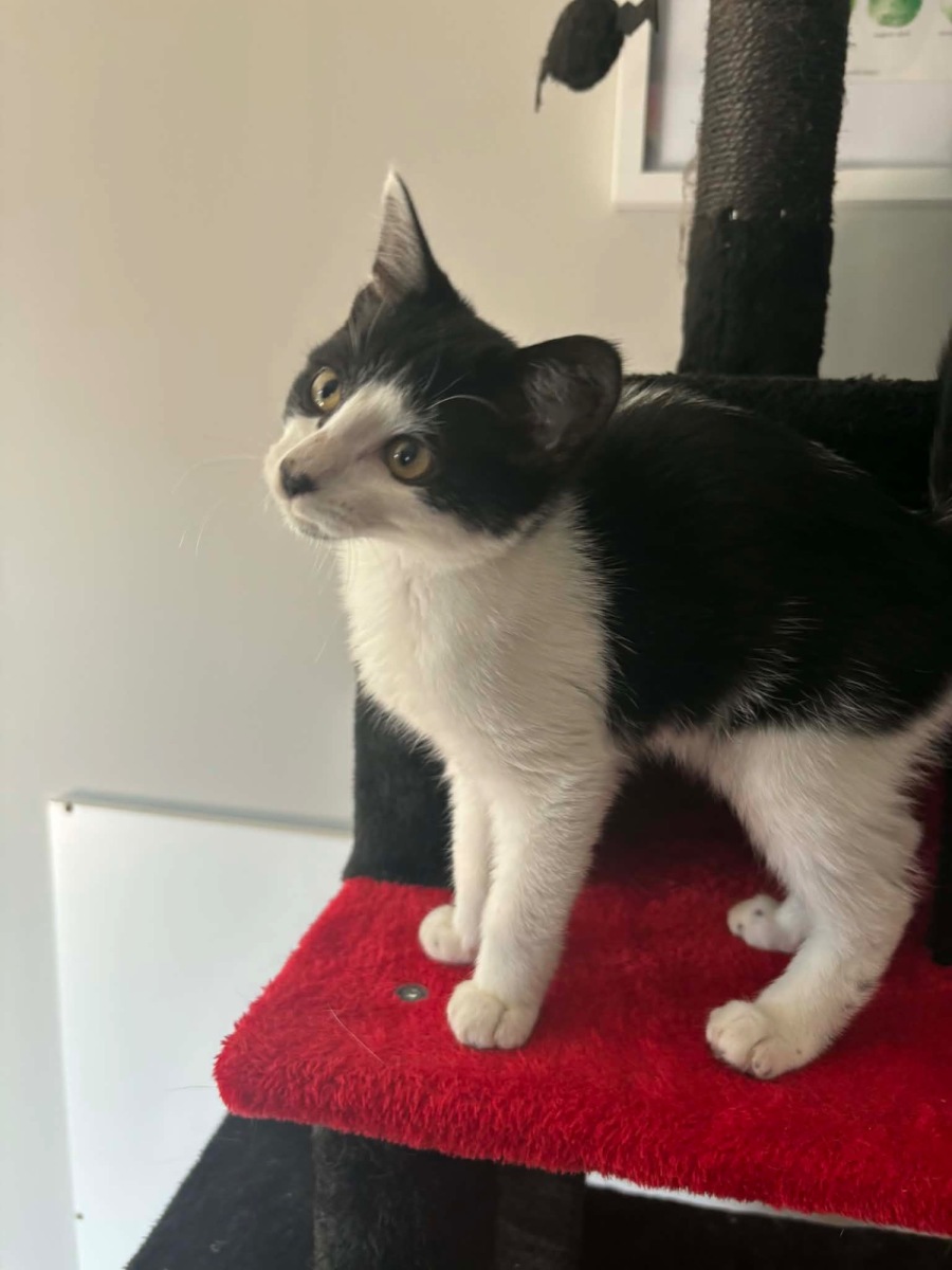 With his striking tuxedo markings and gentle nature, Gomez is as charming as he is devoted. He adores cuddles, happily soaking up attention and purring contentedly whenever he’s near his people.
