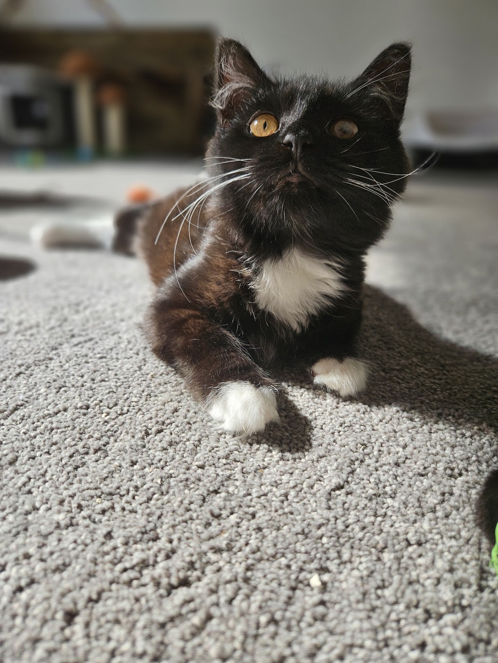 She loves to play and do zoomies in the mornings and evenings but prefers to find a small dark place to nap away the day, her preferred places being under the couch or bed.