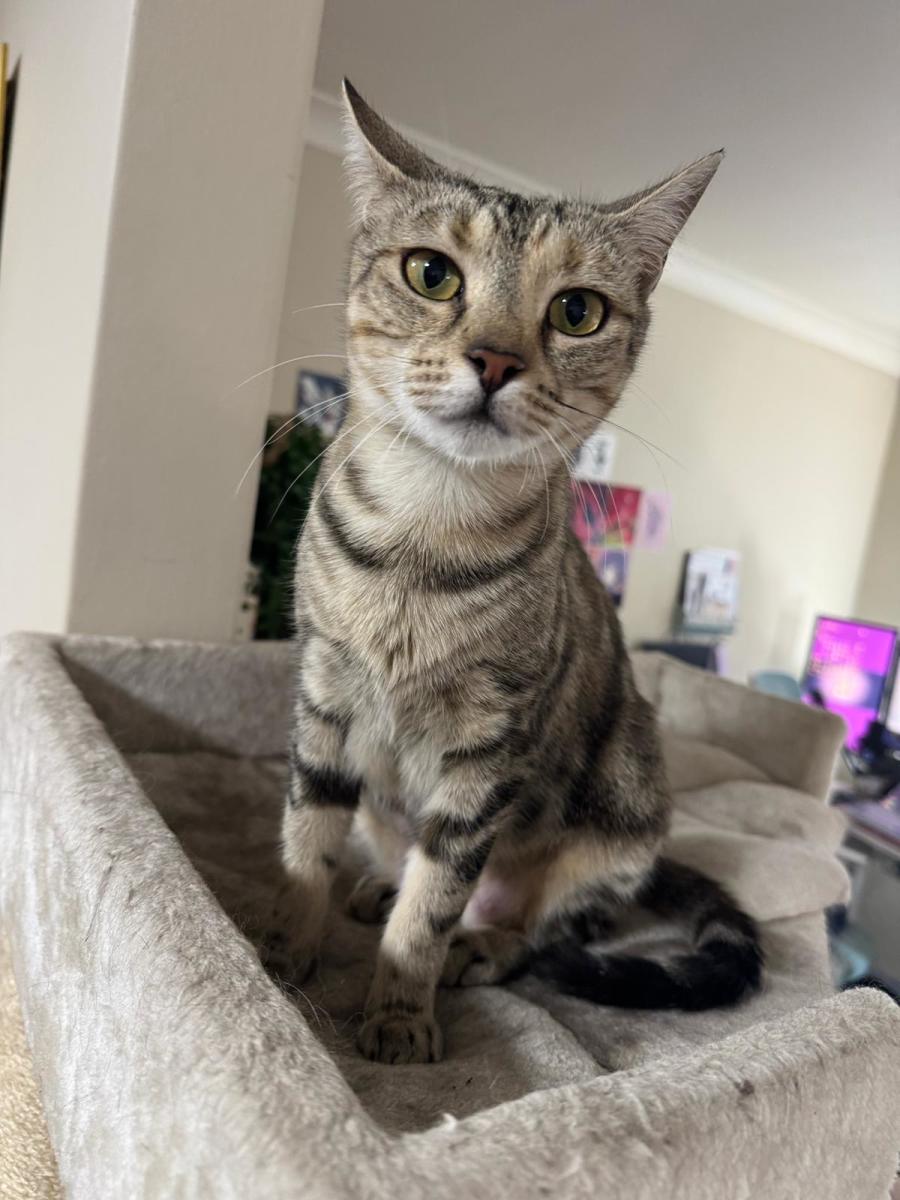 Miso is very affectionate, vocal & playful! If you lay down she’ll snuggle up right up to you for pets and cuddles. She’ll meow for pets (and food!) and follow you around like a cute little shadow! Extremely sweet & loving kitty.