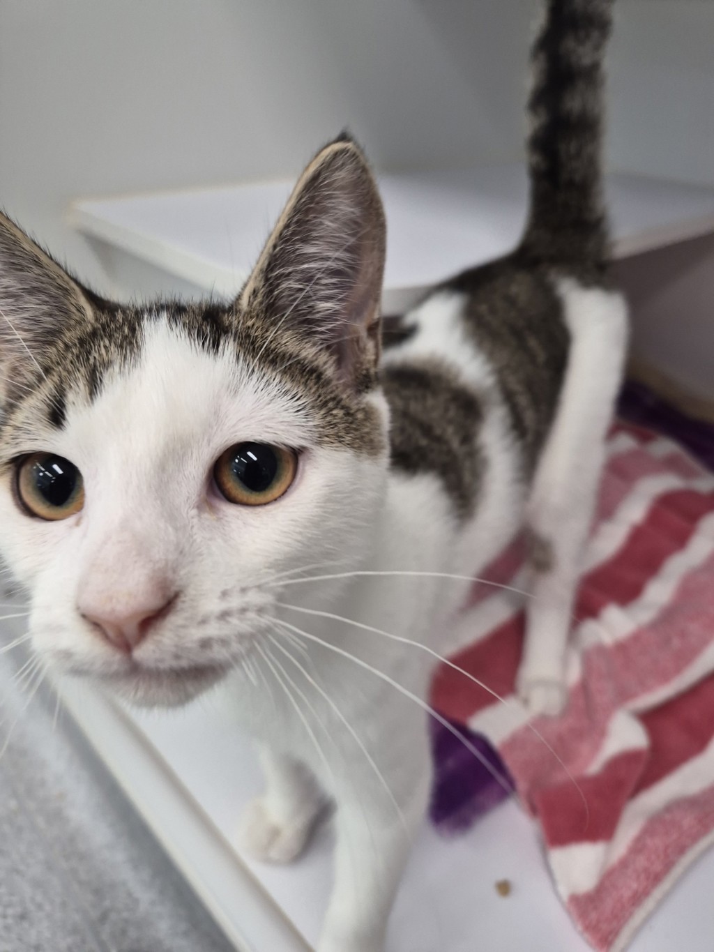 Carlos is a young, playful kitten and full of energy, curiosity, always ready to chase toys and explore every corner of their home. With a big love for food, his highly motivated and easy to engage during mealtime or training. He enjoys interactive play, cuddles after a long day of fun, and would thrive in a home that can match his lively spirit. Carlos would make a wonderful companion for someone looking for a fun, affectionate, and food-loving feline friend. He may do well with a feline friend.