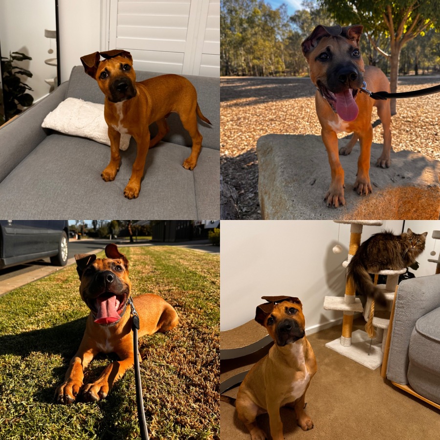 Meet Koju, your future best friend and biggest cuddle bug! 🥹✨ This gorgeous tan and black Staffy x has been in loving foster care since he was just 4 weeks old, and has grown into the sweetest, most eager-to-please little boy 💛