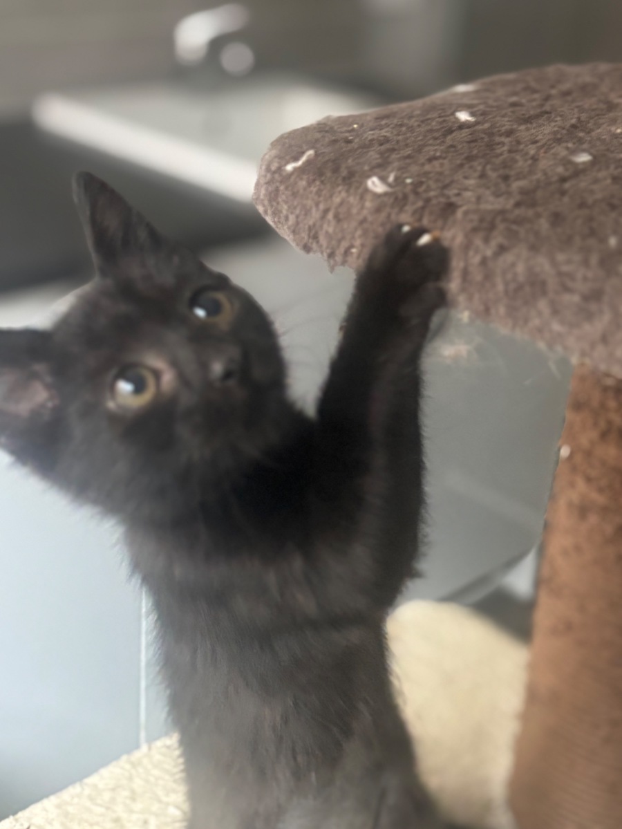 Ariana is a tiny black kitten with a big personality and an even bigger purr. Sleek as midnight and soft as velvet, she shifts from playful mischief to cozy cuddles in seconds—chasing shadows one moment, ruling her nap spot the next.