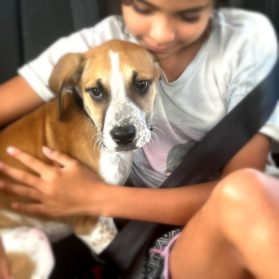 Now safely in the care of one of our most experienced foster carers (and very enthusiastically adored by her children!), Goldie is soaking up everything a happy puppyhood should be — cuddles, playtime, and plenty of attention. And yes… kids do love puppies — and Goldie loves them right back!