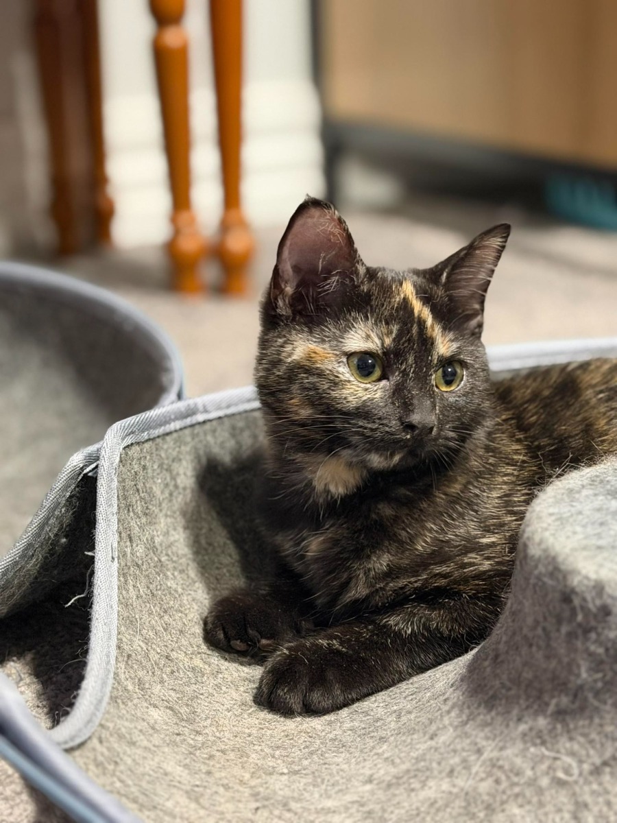 Meet Tezza, a gorgeous tortoiseshell Domestic Medium Hair (DMH) girl bursting with personality and ready to find a loving home. Full of beans and charm, Tezza is playful, curious, and always up for a bit of fun, bringing energy and joy wherever she goes. She loves to explore her surroundings, chase toys, and keep herself entertained, but also enjoys affection and spending time with her people once she’s had her playtime.