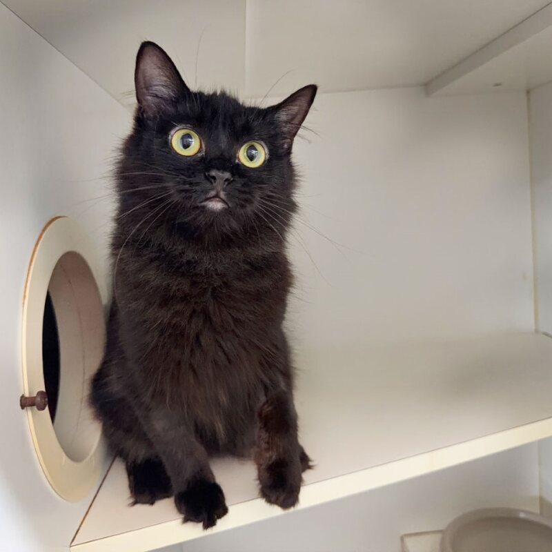 Sabrina is a beautiful black cat with a gentle soul and a quietly blossoming personality. When she first arrived, she was quite shy and unsure of the world around her. With time, patience, and a little love, she has truly come out of her shell and revealed her affectionate nature.